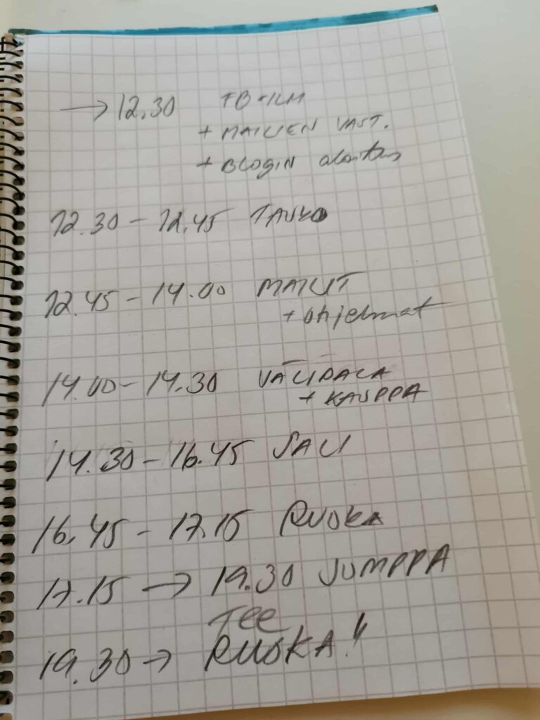 Kun mulla on toimistopäivä maanantaina (kuva alla maanantaista) ja joskus torstainakin, teen aamulenkin ja muiden aamutoimien jälkeen listan päivän aikataulusta. Siten saan paremmin aikaan, kun erilaiset toimet on listattuna ja noudatan sopimiani aikoja. Joskus, jos on vaikea aloittaa tai huomaan poukkoilevani eri tehtävien välillä (tai selaan turhautuneena somea), suljen häiriötekijät kauemmas, laitan kellosta esim. 30 min kulumaan ja alan suorittaa. Päätän, että 30 minuuttia teen täydellä fokuksella töitä ja sitten pidän tauon. Se toimii lähes sataprosenttisesti!